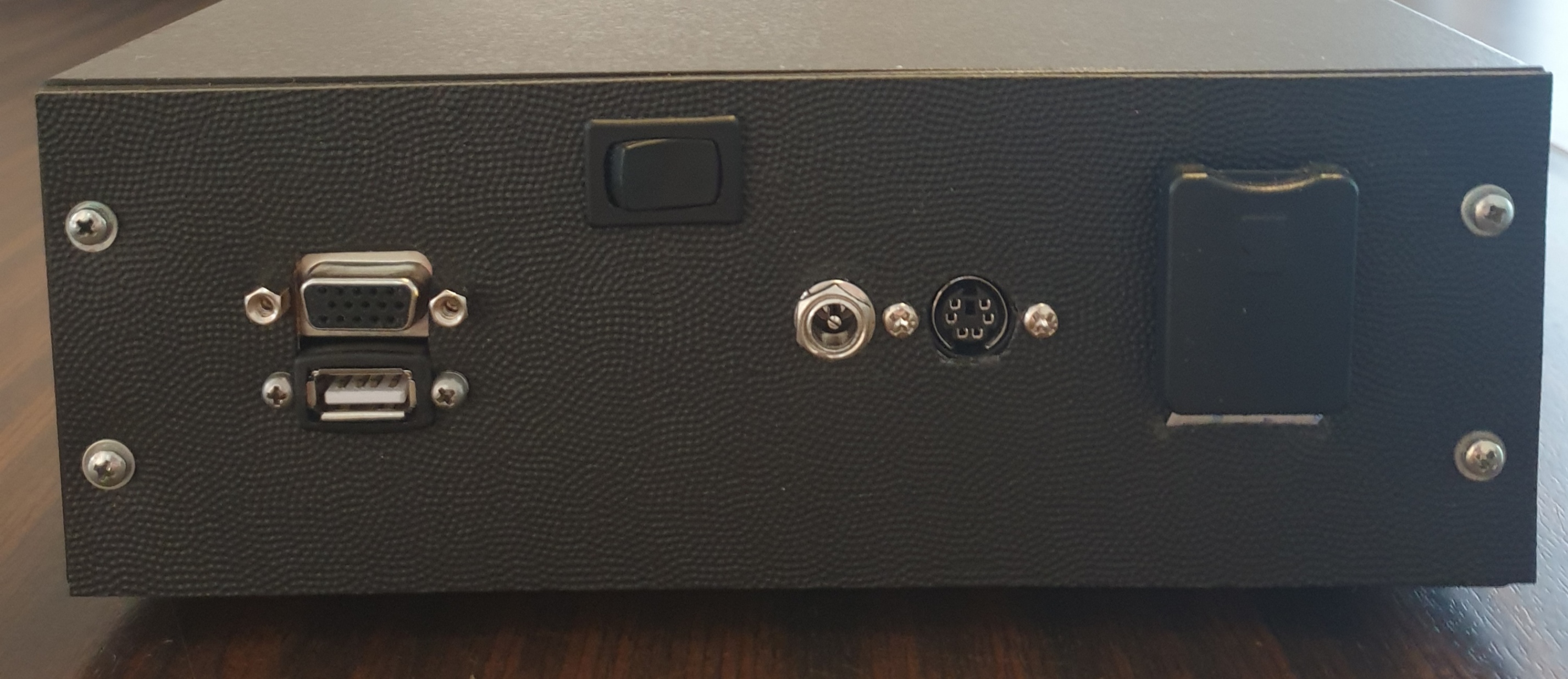 I used an SD card reader extension cable and used double-sided tape to mount the card reader on the back panel.  I also had to make short power, VGA, and PS/2 Keyboard adapter cables to bring the 9V supply, monitor and keyboard connections to the back panel as well.